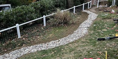 This dry stream does more than just break up the side yard. The downspouts from the home are connected to drainage pipes that are buried and discharge within the rock, which then funnels the water away from the property.